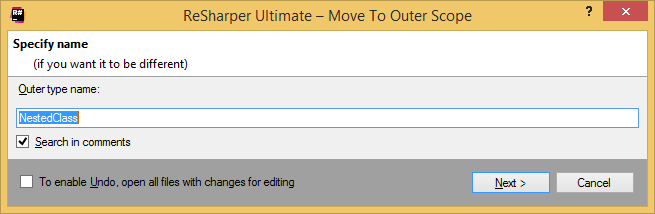 ネストされた型でこのリファクタリングを呼び出すと、ReSharper は親クラスを部分的にし、部分クラスの新しい部分用に新しいファイルを作成し、選択した型をそこに移動します。必要に応じて、型を外部スコープに移動リファクタリングを使用して、型をネストしないようにし、親クラスの冗長部分を削除できます。