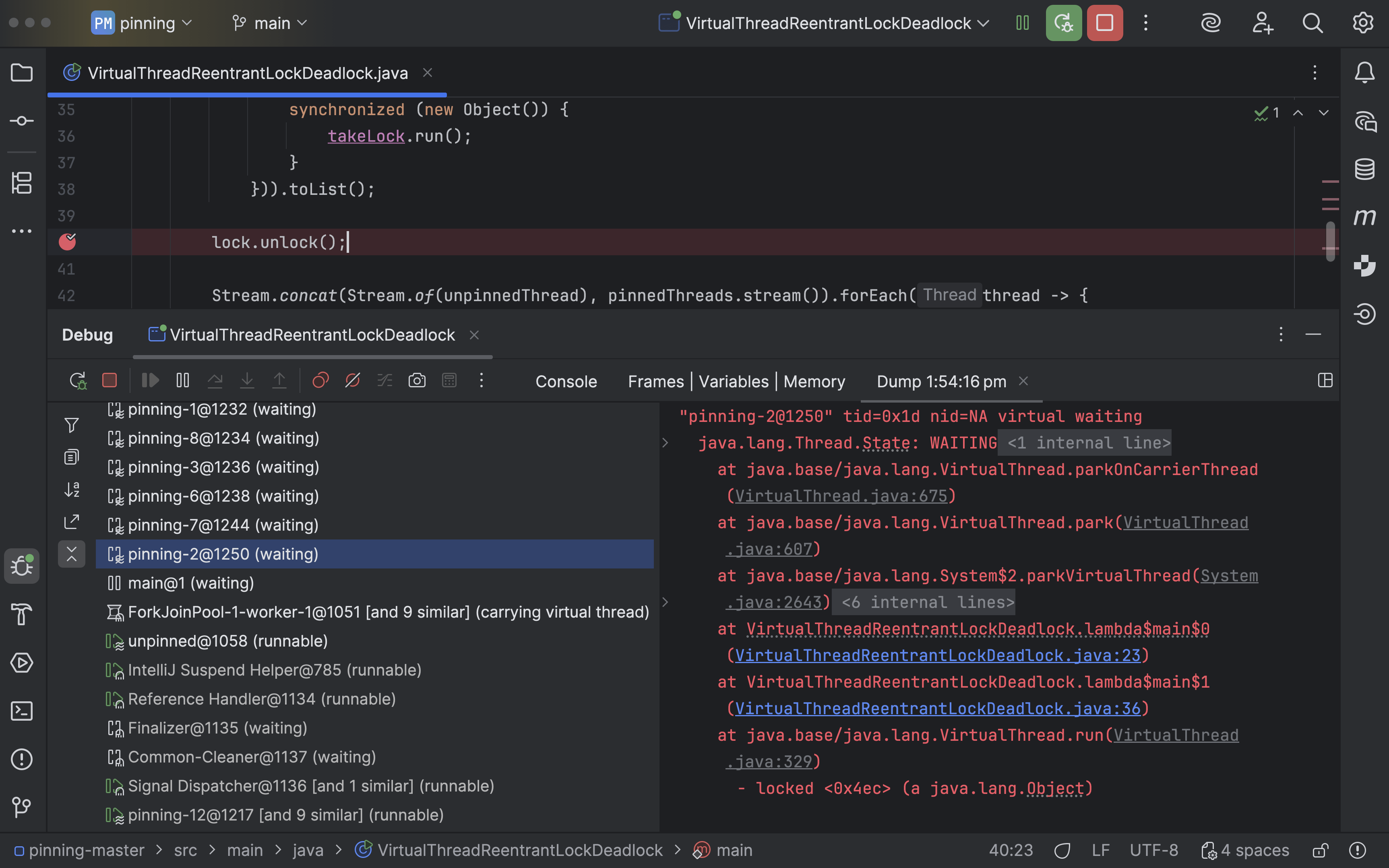 アプリが一時停止中やブレークポイントにある場合でも、スレッドダンプ内の仮想スレッドを収集して調査できるようになりました。IDE では、各仮想スレッドがロックされているオブジェクトが表示されるため、ボトルネックの診断に役立ちます。ビューがオーバーロードになるのを防ぐため、同一のスタックトレースを持つスレッドは自動的にグループ化されるため、大きなダンプでも簡単に移動できます。