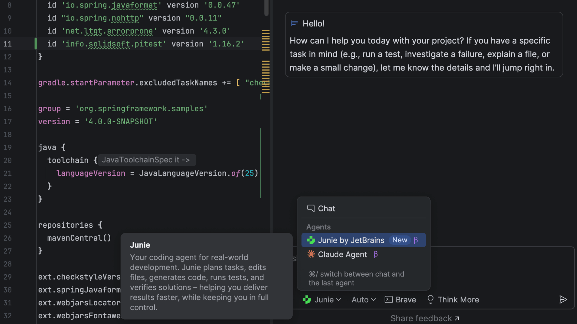 独自のキーを使用して AI プロバイダーに接続し、共通のチャットインターフェースから Junie および Claude エージェントと連携し、IntelliJ IDEA で AI クレジットを直接追跡できるようになりました。