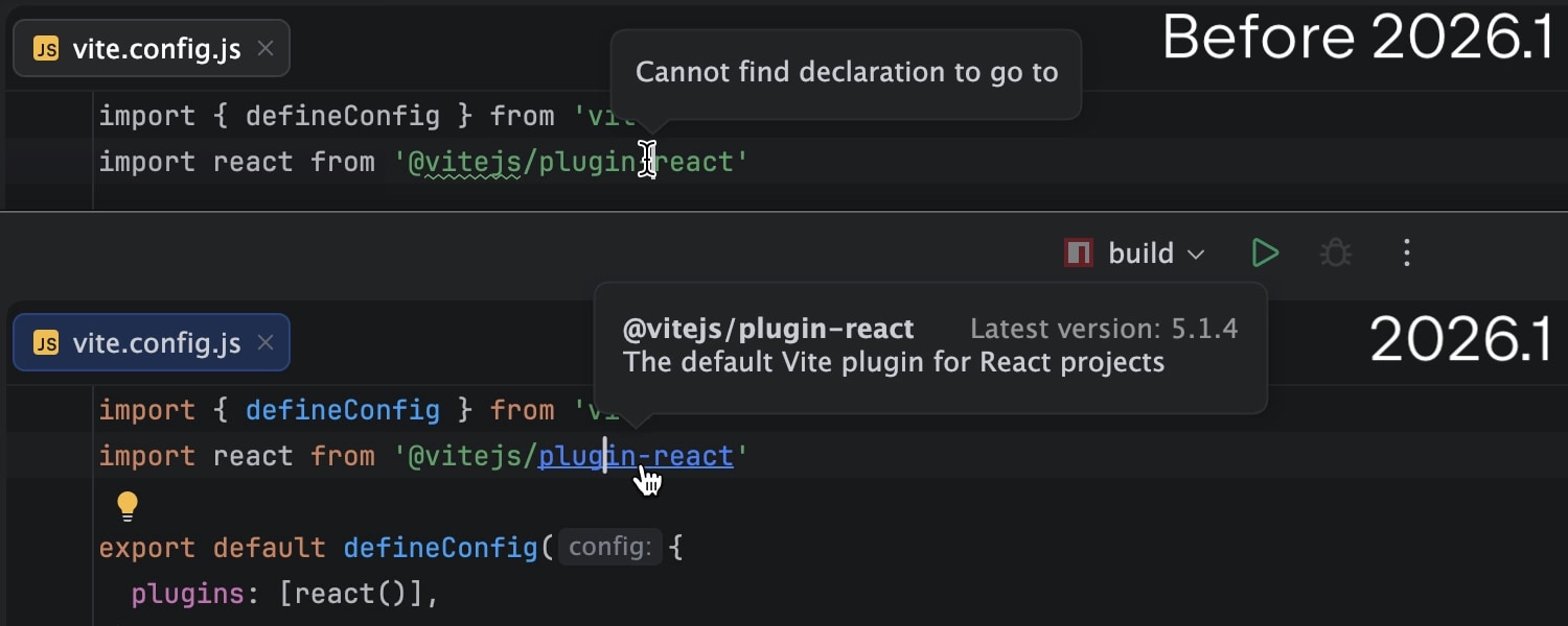 サービス駆動型タイプエンジンで TypeScript サポートがデフォルトで実行されるようになったことで、よりスムーズで信頼性の高いワークフローを体験できます。プロフェッショナルグレードの開発向けに最適化されたこのアップデートでは、大規模なエンタープライズプロジェクトでも、より正確な型推論と大幅な CPU 使用率の低減を実現します。TypeScript サポートは、パスエイリアスとプロジェクト参照の自動インポート処理の改善、および Go ベースの TypeScript 言語サーバーからのインレイヒントの統合により、さらに強化されています。JavaScript 解析では、文字列リテラルの import / export 指定子も正しく処理されるようになりました。