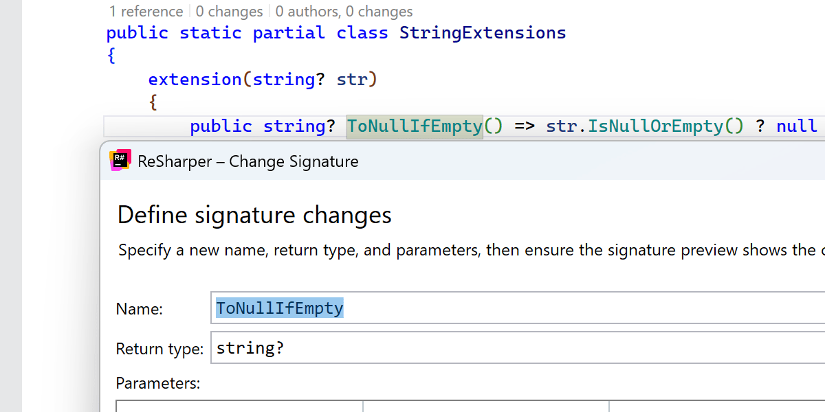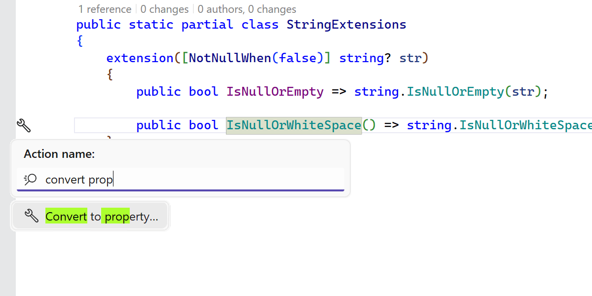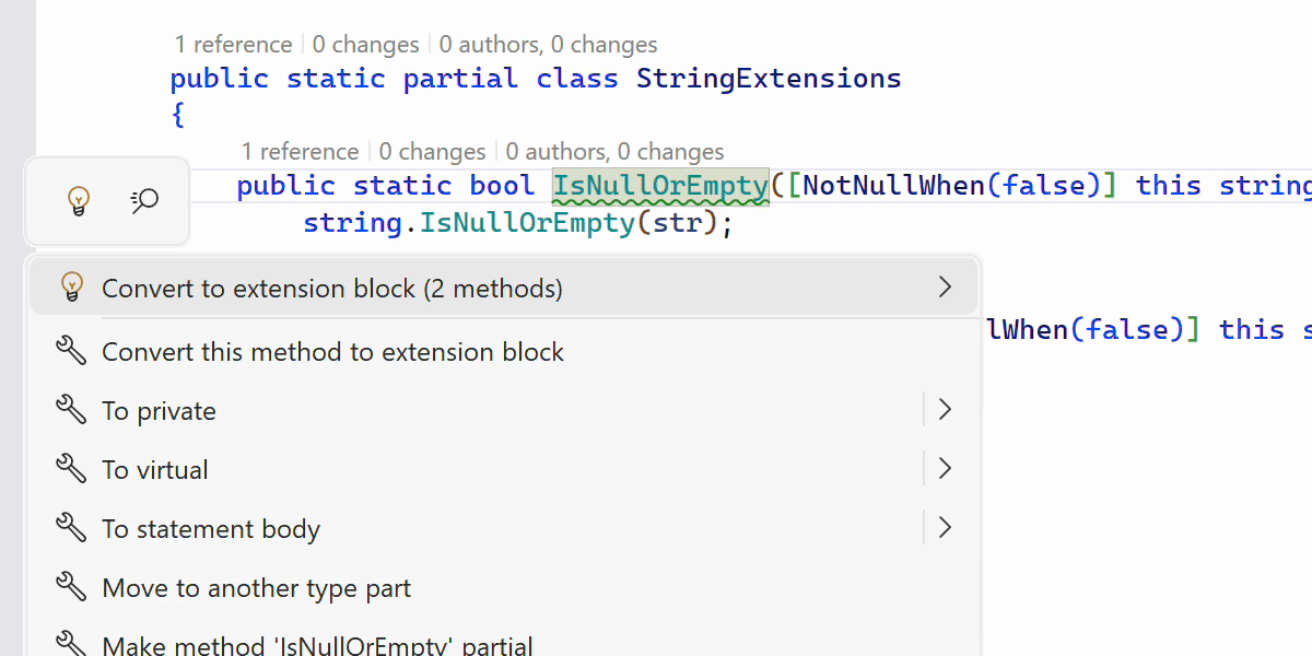 C# 14 拡張のサポートを最終調整し、従来サポートされていたメソッドとプロパティに加え、拡張演算子のサポートを追加しました。さらに、 シグネチャーの変更、 メソッドをプロパティに変換する、static にする、 安全な削除を含むすべての利用可能なリファクタリングが、拡張メンバーで動作するように更新されました。