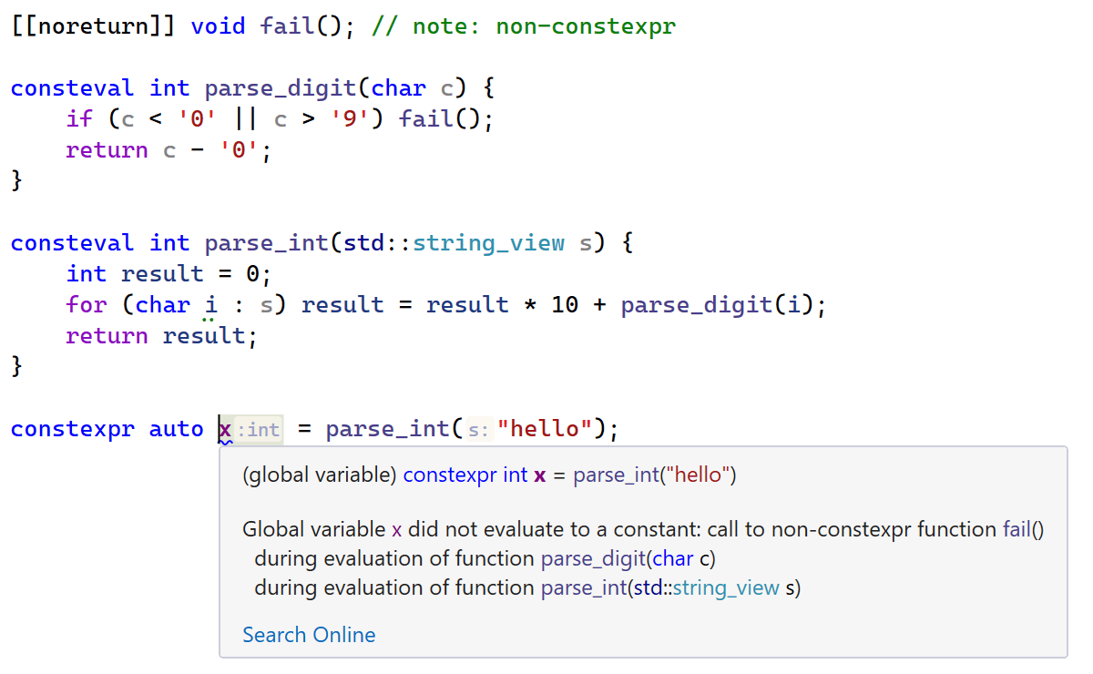 ReSharper C++ 2025.3 は、パックインデックス、展開文、構造化バインディングにおけるパック、契約など、最新の言語標準のいくつかの主要な機能を取り入れ、C++26 のサポートを強化しました。また、コード解析を強化する constexpr 評価エンジンを改善し、constexpr 評価の失敗を検出して詳細な評価トレースを表示する新しいインスペクションを追加しました。
