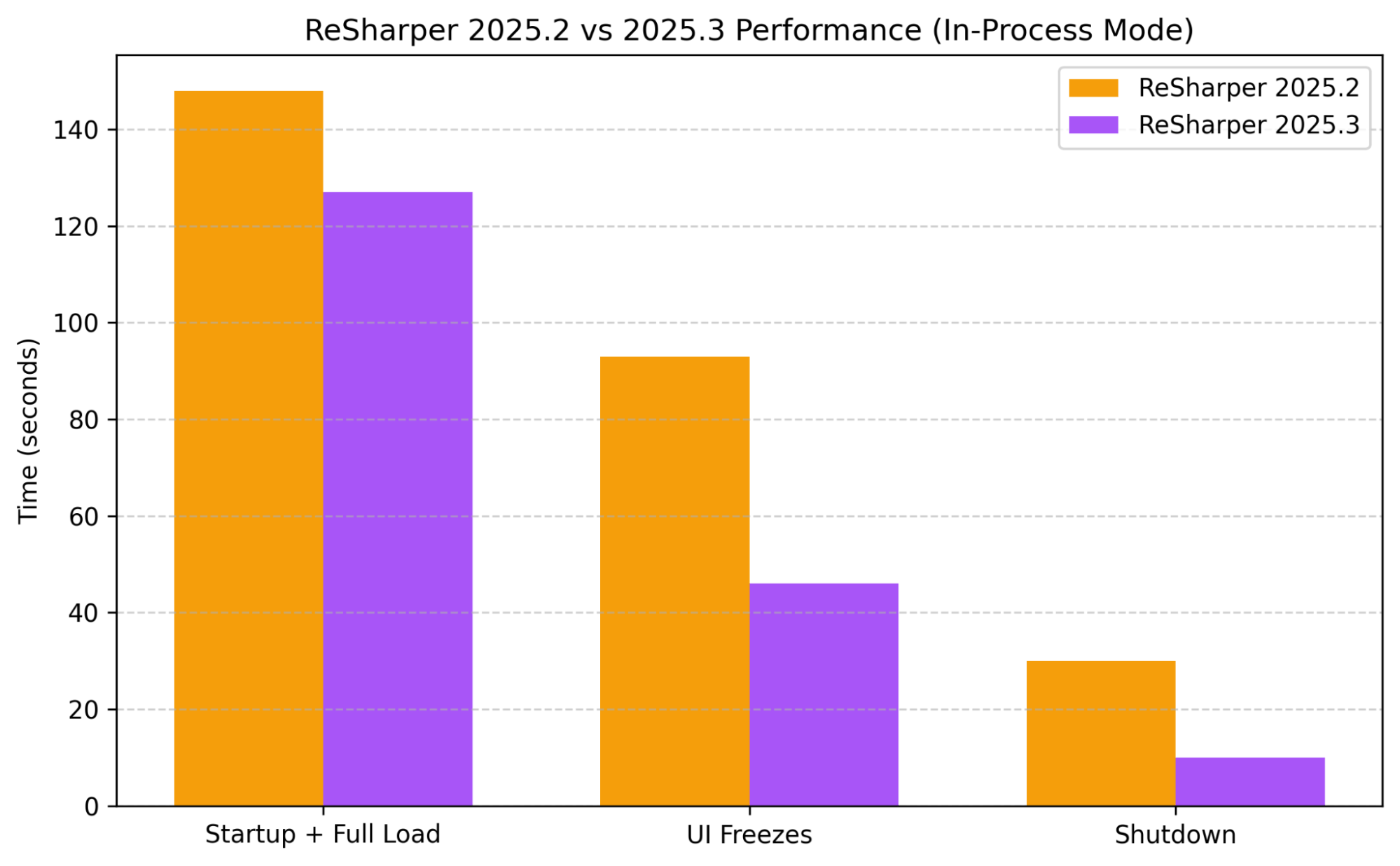 ReSharper 2025.3 は、2025.2 リリースと比較して、 進行中モードで顕著なパフォーマンスの向上を実現します。