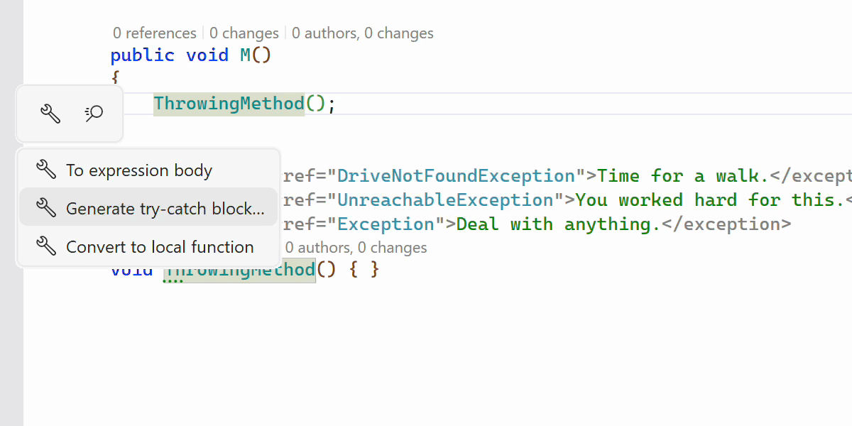 このリリースでは、XML ドキュメントに基づいてメソッド呼び出しの周囲に try-catch ブロックを自動的に生成する新しいコンテキストアクションが導入されています。