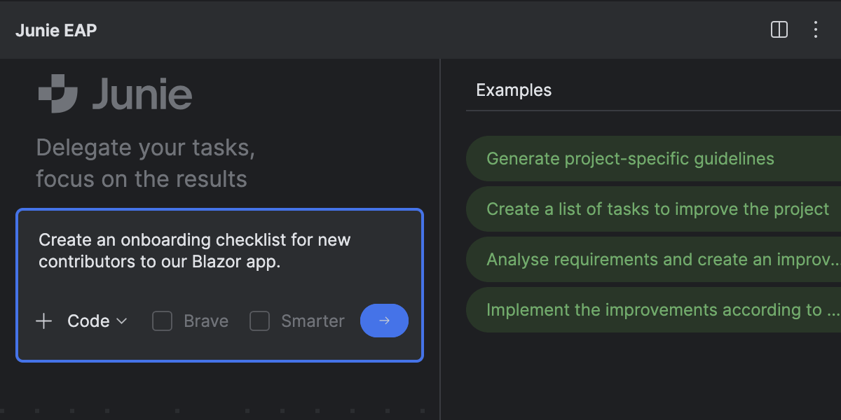コーディングエージェントは、実際の開発者のタスクに焦点を当てて開発されているため、導入が容易になり、信頼できる結果が得られます。Junie は単純なタスクも実行できますが、より複雑なタスクを任せた時に真価を発揮します。コーディングタスクの委譲には コードモード、機能や新しいソリューションのブレインストーミングには 確認するモードをご利用ください。