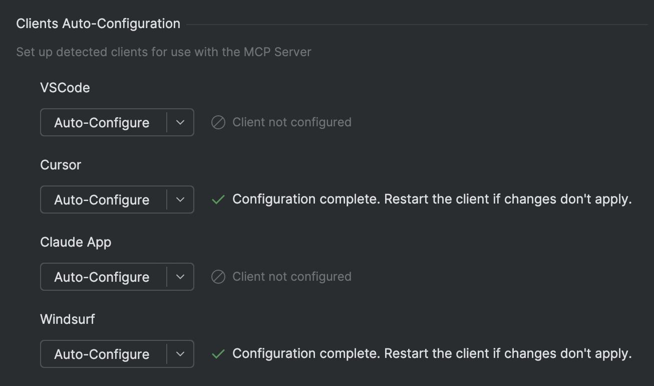 JetBrains IDE は、MCP(モデルコンテキストプロトコル)サーバーのワンクリックセットアップをサポートしました。これにより、サードパーティ製 AI エージェントへの接続が簡単になります。お使いのマシン上で互換性のあるクライアントが検出されると、IDE がサーバーを有効化し、接続を自動構成するように促します。手動セットアップは不要です。