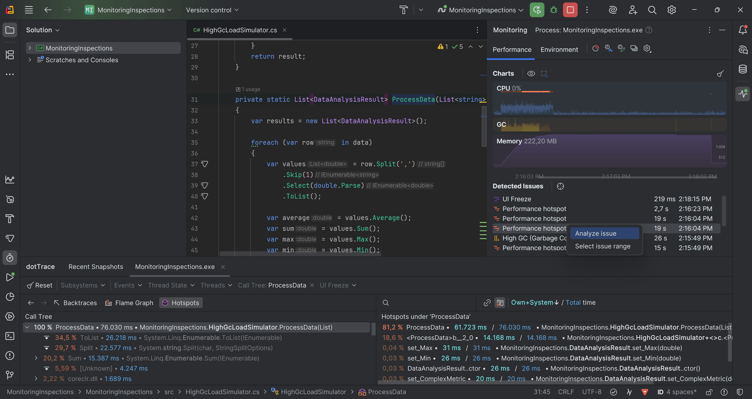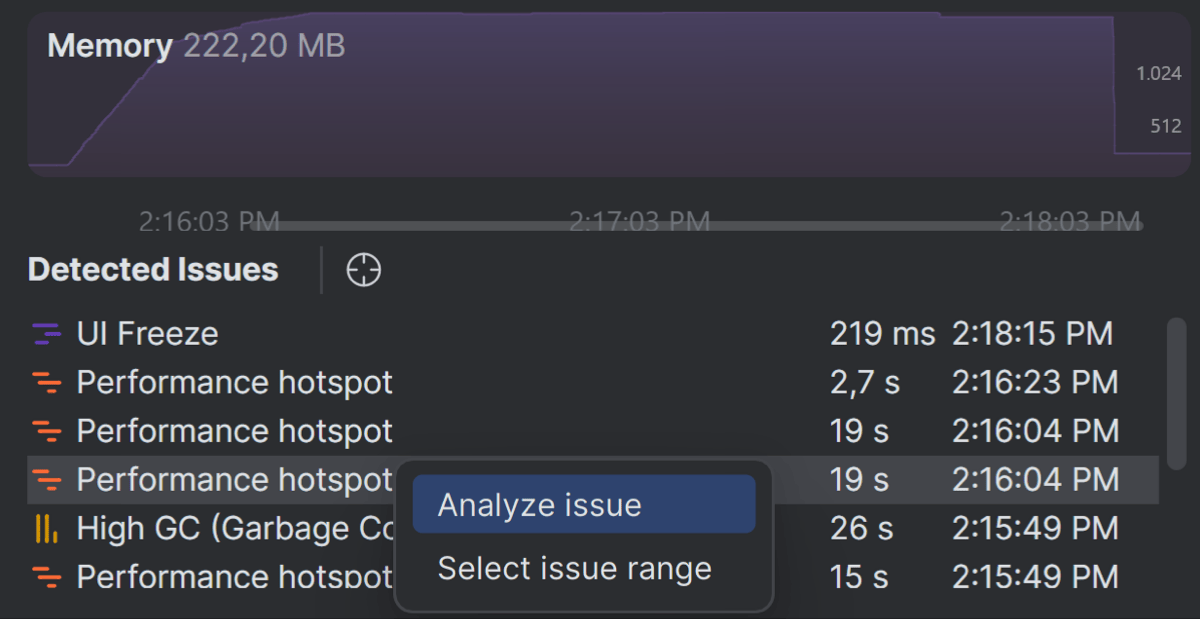 刷新された モニターツールウィンドウにより、.NET アプリケーションのパフォーマンス最適化が簡単になります。CPU 使用率、メモリ消費量、ガベージコレクションアクティビティに関する対話的なチャートが追加され、パフォーマンスまたはメモリプロファイリングセッションを開始してより詳細な分析を行うことができます。Windows では、パフォーマンスのボトルネックを自動検出することもできます。チャート上の検出結果をクリックするか、時間間隔を選択すると、バンドルされている dotTrace プロファイラーでコールスタックデータが開き、エディターで原因となっているメソッドに直接移動できます。