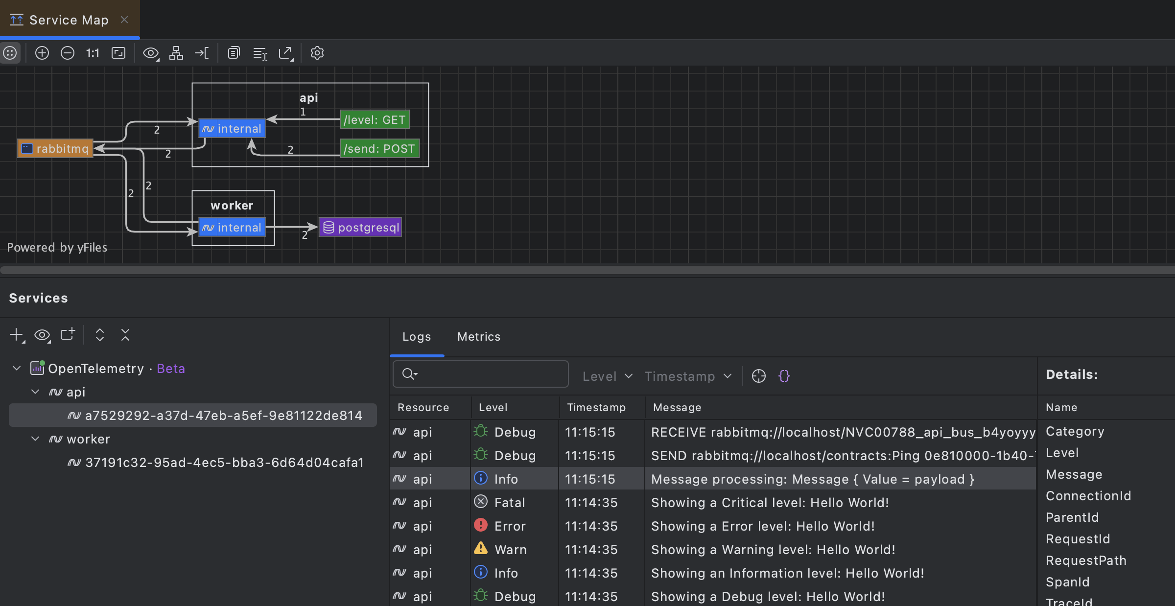 新しい OpenTelemetry プラグインを使えば、IDE を切り替えずにランタイムの可観測性を実現できます。このプラグインは、ログとメトリクスを Rider に直接取り込みます。任意のログエントリから原因コードに直接アクセスし、パフォーマンスメトリクスを視覚化し、アプリケーションのフローに基づいて自動生成されたアーキテクチャダイアグラムを確認できます。これにより、外部ダッシュボードを必要とせずに、開発中およびテスト中のシステムの動作を把握できます。