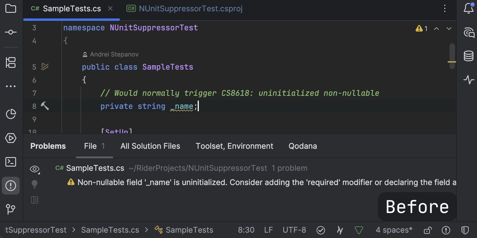 Rider は、Roslyn ベースのサプレッサーを完全にサポートするようになりました。これにより、ソースファイルの内容を乱雑にすることなく、カスタムロジックで不要な警告を抑制できます。従来の [SuppressMessage]