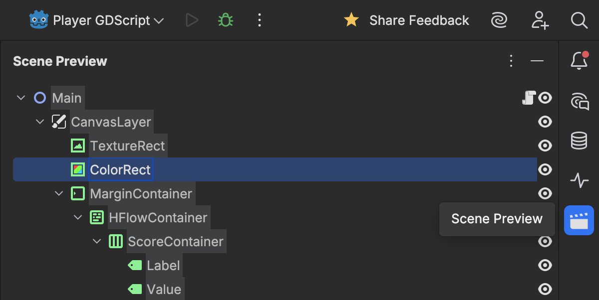 また、現在のシーン内のすべてのノードを表示する シーンプレビューツールウィンドウと、現在のシーンの実行、親メソッドのハイライト表示、リソース使用量の監視、接続されたシグナルの確認などを行うためのエディター内アイコンも用意されています。インスペクションは、到達不能コードや戻り値の型の不足または誤りなどの問題をチェックできます。また、Godot エディターよりも詳細な分析を実行でき、型指定されていない値や意図しない暗黙的なキャストに対してより厳密な分析が可能です。さらに、問題を修正したり、小さな変更を加えたりするための Alt+Enter アクションも多数用意されています。
