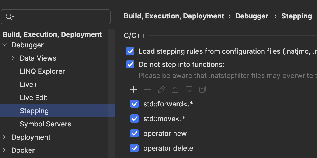 パワーユーザー向けに、ステップフィルターという便利な機能を追加しました。これにより、特定のメソッドに対する ステップインの動作が変更されます。メソッドまたは関数がスキップ対象としてマークされている場合、 ステップインアクションは ステップオーバーのように動作し、デバッグ中に「ライブラリ」コードを操作しやすくなります。