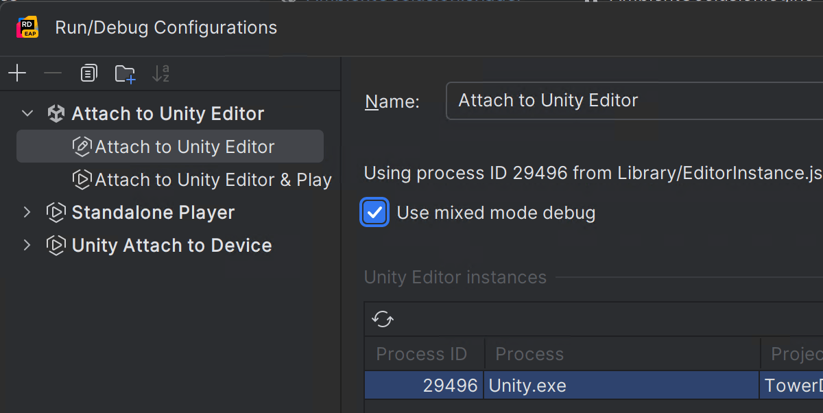 ご要望の多かった機能の一つとして、マネージドコードとネイティブコードの両方をデバッグできる機能、特に Unity プロジェクトでのデバッグ機能が追加されました。Rider 2025.2 では、Unity プロジェクトの混合モードデバッグがサポートされるようになりました。これにより、C# コードと C++ コードの両方にブレークポイントを設定し、両コード間をステップ実行できるようになりました。実行構成エディターのチェックボックスをオンにすることで、混合モードデバッグを有効化できます。