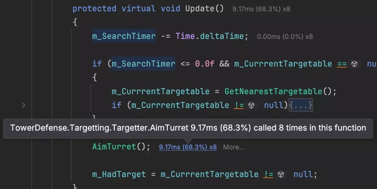 Rider と Unity プロファイラーの連携をデフォルトで有効化しました。この機能は 2025.1 でテスト的に導入されましたが、この度デフォルトで有効化されました。Unity でプロファイリングを行うと、Rider は自動的に詳細を読み込み、パフォーマンス情報をエディターに直接表示します。