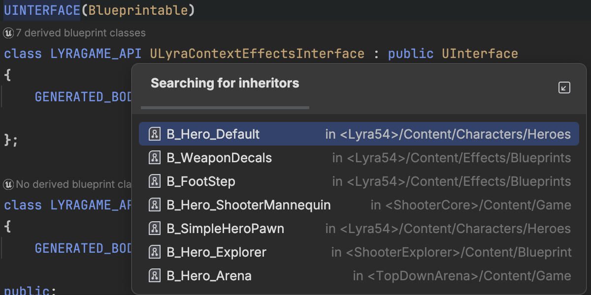 の 使用箇所を表示 ブループリント内でコードが使用されている場所を表示するための Rider の優れたサポートが拡張され、UINTERFACE