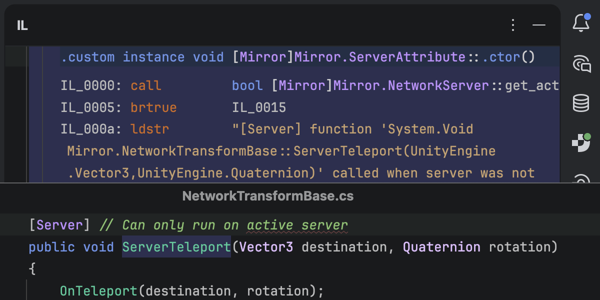 IL Viewer ツールウィンドウには、IDE ビルドによって生成された一時アセンブリではなく、Unity によって生成および後処理されたアセンブリの中間言語 (IL) コードが表示されるようになりました。これにより、Unity が実際に使用するものに基づいてコンパイル結果を分析できるようになります。