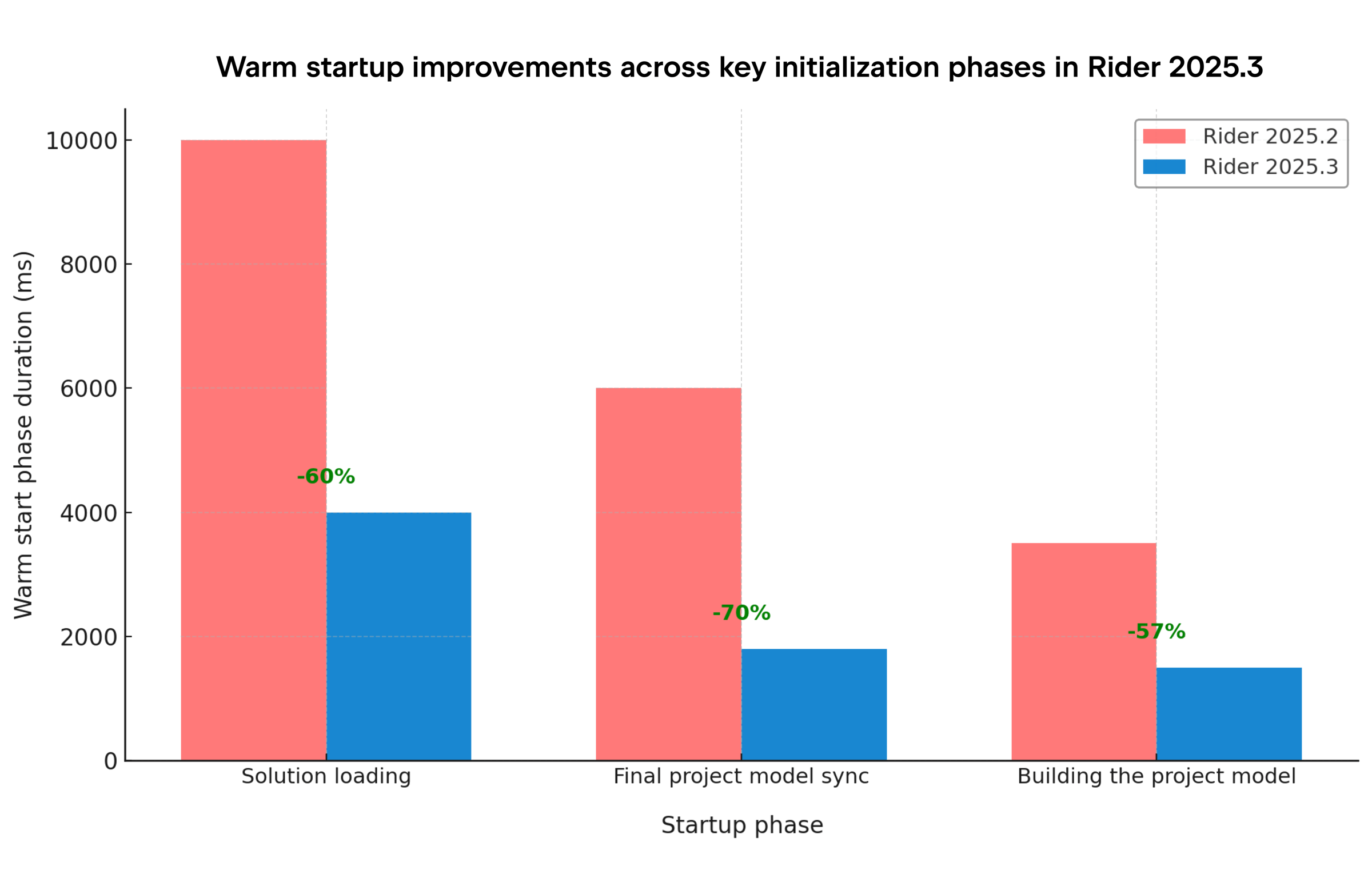 Rider 2025.3 は、起動パフォーマンスと全体的な応答性を大幅に向上させます。複数の内部初期化フェーズが最適化されたことで、ソリューション全体の読み込み時間が短縮され、IDE がより早く作業準備を完了できるようになりました。