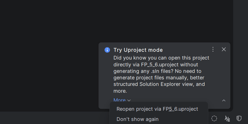 Unreal プロジェクトのナビゲーションをよりスムーズにするために、 ソリューションエクスプローラーで .sln ファイルから .uproject ファイルに直接切り替えることができるようになりました。
