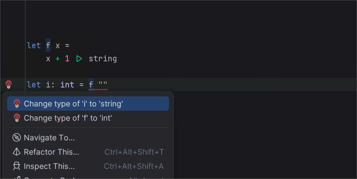 型間違いに関するエラーが発生した場合、ローカル値、適用された引数、関数の戻り値型、ユニオン case フィールド、プロパティなどについて簡単に修正できるようになりました。さらに、これは言語間で機能するため、F# コードでエラーが発生した場合は C# 宣言を修正でき、その逆も同様です。