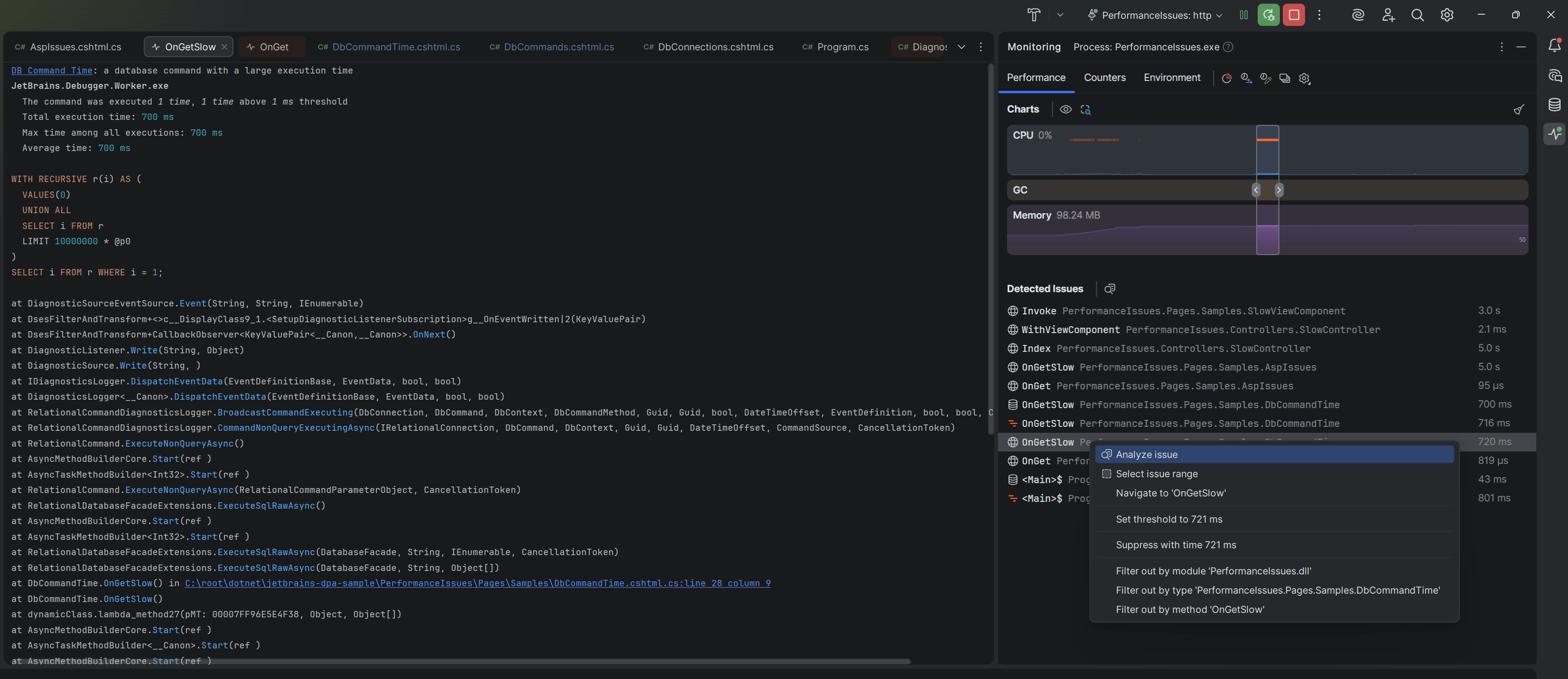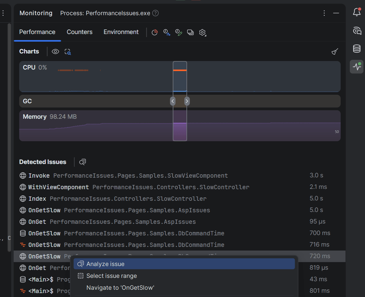 Rider 2025.3 の モニターツールウィンドウは、リアルタイムのパフォーマンス分析のための単一のハブへと進化しました。CPU、メモリ、GC アクティビティに加え、ASP.NET とデータベースの問題も検出します。Rider は、アプリの実行中またはデバッグ中に、低速なクエリ、長時間実行される MVC アクション、過剰なデータベース接続を自動的にハイライト表示します。