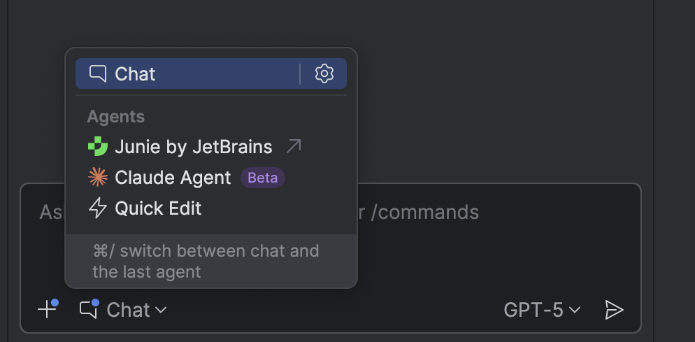 エージェントを使い始める最も簡単な方法は、AI チャットから直接起動することです。ただし、Junie をこの方法で使用したい場合、Junie プラグイン(および一部の専用機能)は引き続きご利用いただけます。