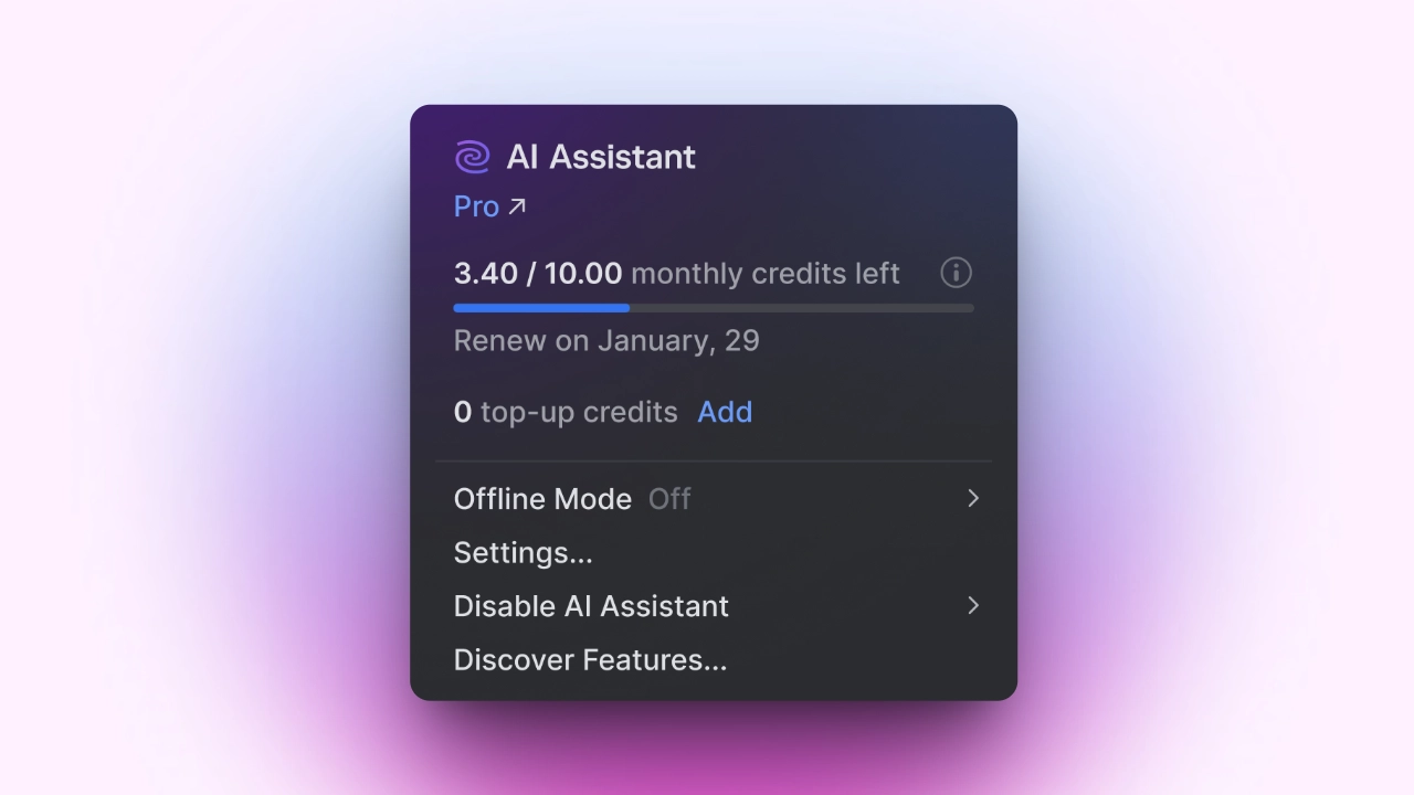 残りの AI クレジット、更新日、トップアップ残高を IDE 内で直接確認できるようになりました。クレジットが不足した場合は、そこからトップアップを開始することもできます。
