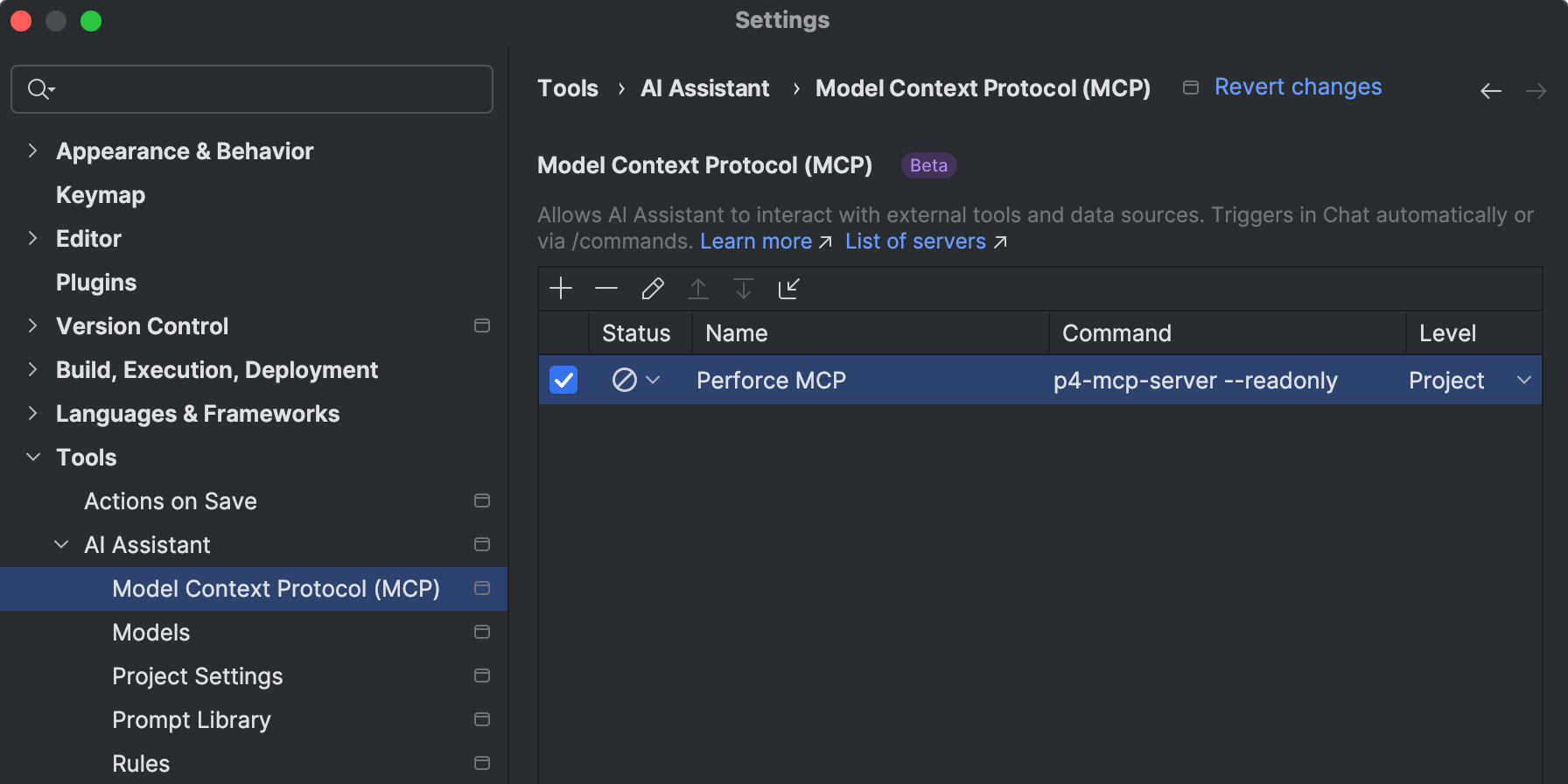 Perforce との提携により、JetBrains Rider は、簡素化されたインストールプロセスと IDE 内で直接 MCP ツールをシームレスにアクティブ化することで、Perforce MCP サーバーのセットアップと使用のためのすぐに使用できるサポートを提供するようになりました。