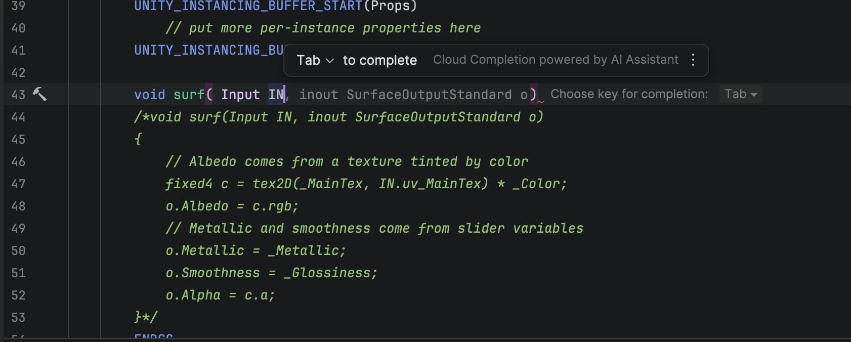 Rider は、Unity、Unreal Engine、Godot プロジェクトのシェーダー向けに、クラウドベースの複数行コード補完を提供するようになりました。Godot 開発者向けには、GDScript ファイル用のクラウド補完候補もご利用いただけます。