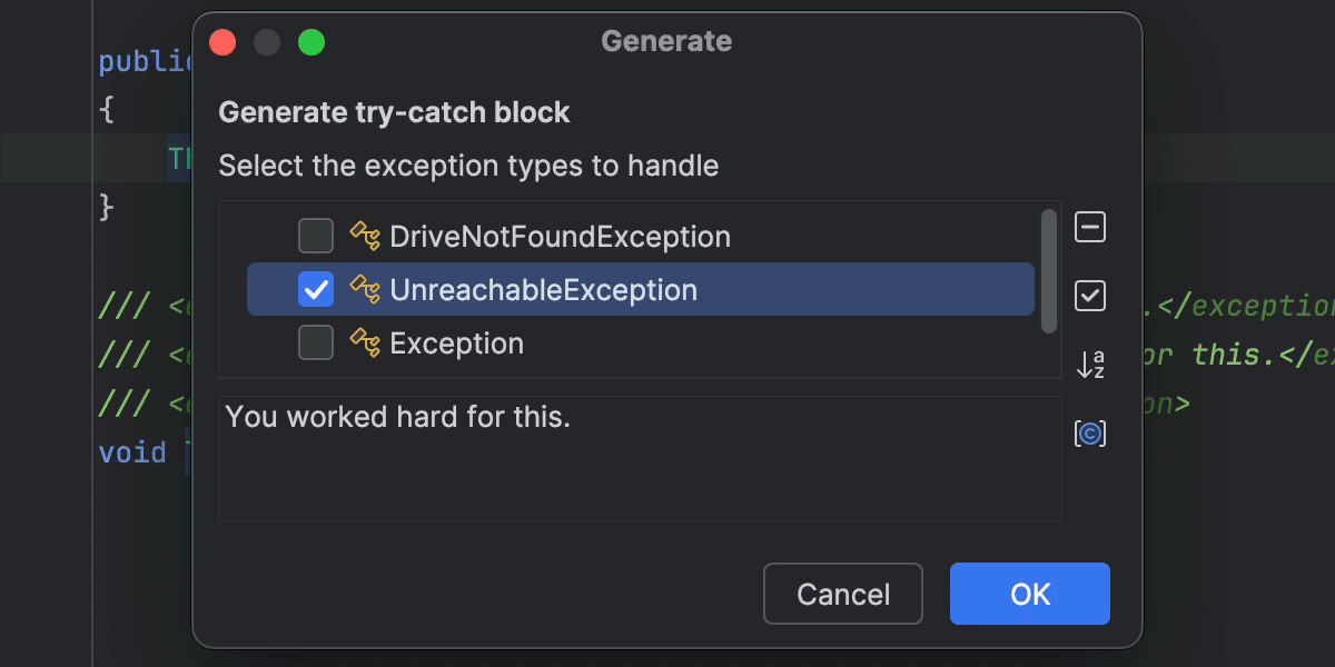 Rider 2025.3 では、XML ドキュメントに基づいてメソッド呼び出しの try-catch ブロックを自動的に生成する新しい try-catch ブロックを生成するコンテキストアクションが導入され、宣言された例外をより迅速かつ一貫して処理できるようになります。