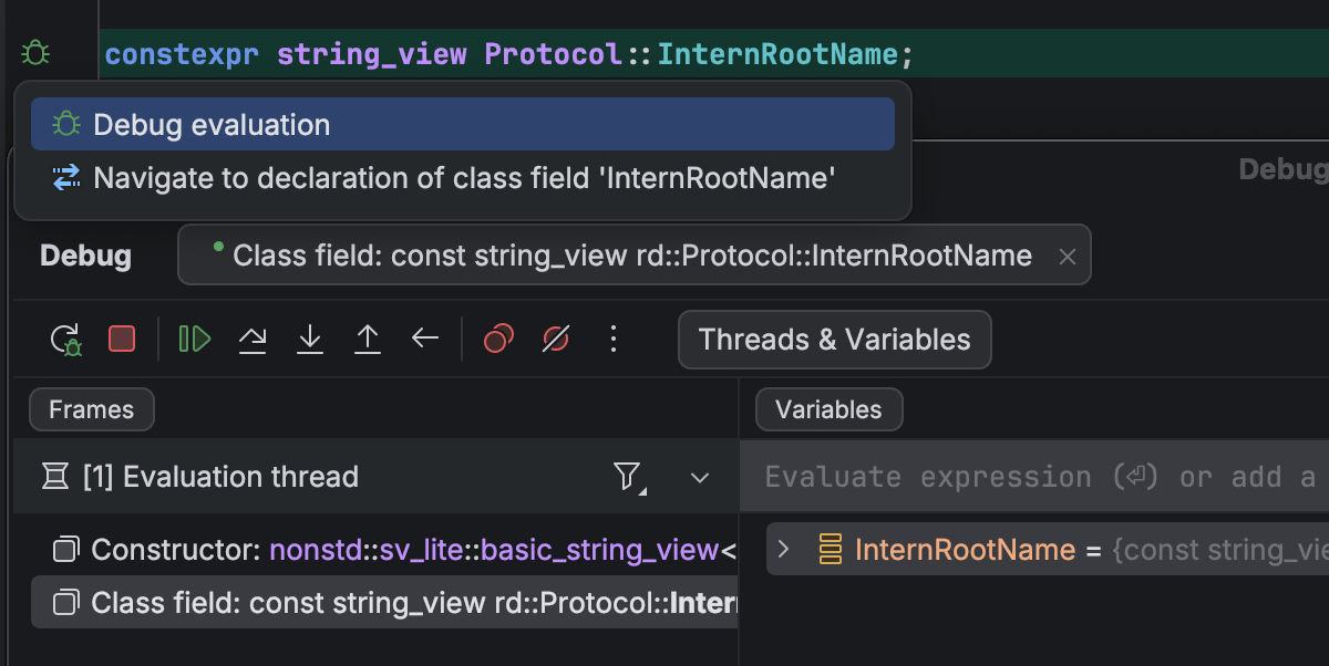 constexpr 式のデバッグ Rider は、C++ でますます。重要になっている constexpr コードのデバッグをサポートするようになりました。通常のランタイムデバッグと同様に、constexpr 関数内で実行を一時停止したり、変数をインスペクションしたり、式を評価したりすることができます。詳しくは、こちらのブログ記事(英語)を参照してください。