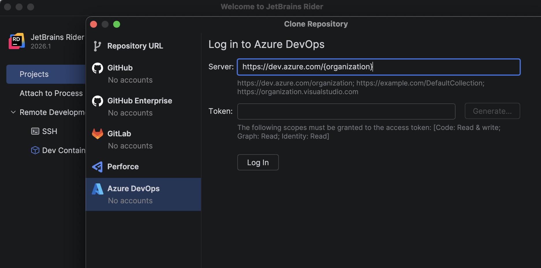 新たにバンドルされた Azure DevOps プラグインを使用すると、Rider からリポジトリを直接クローンできます。