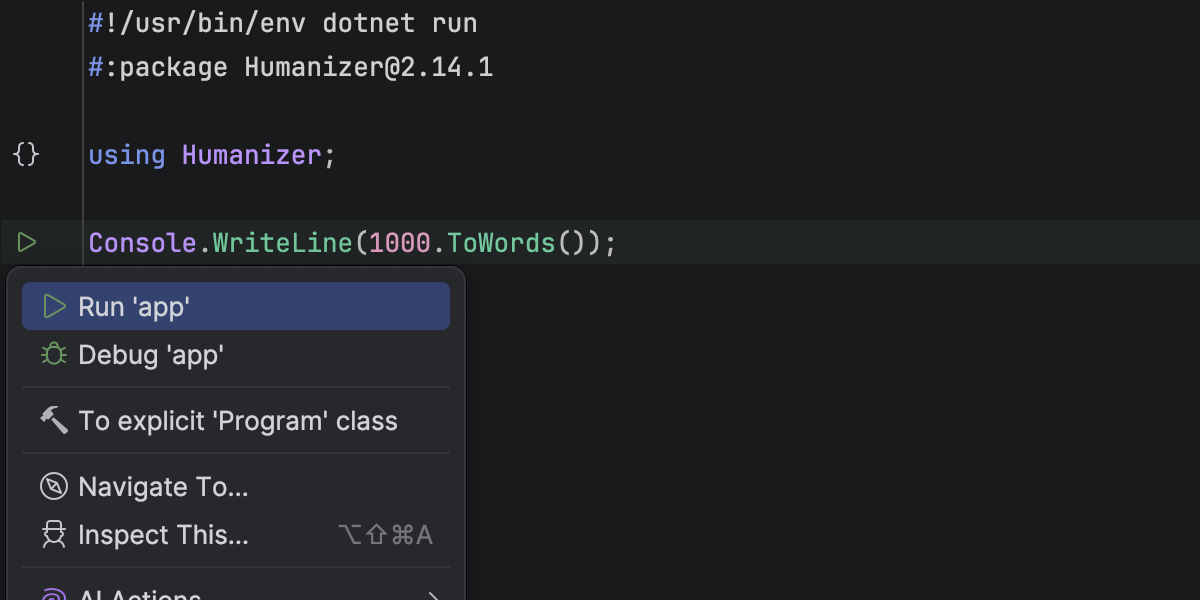 Rider のエディターは、トップレベルのステートメント、#! シェバン、#: ディレクティブを含むファイルベースのプログラム(#:package および #:sdk を含む)を認識します。コードのハイライト表示、コード補完、実行マーカー、デバッグ機能がすべて利用可能で、単一の C# ファイルとして記述されたクイックスクリプト、プロトタイプ、ワンオフツールを作成できます。
