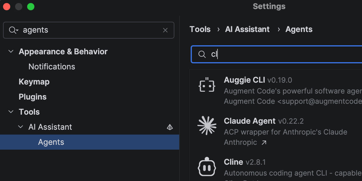 AI チャットでは、Junie、Claude エージェント、Codex に加え、GitHub コパイロットや Cursor(英語) など、より幅広いエージェントを選択できるようになりました。さらに、エージェントクライアントプロトコルを介してサポートされる数十種類の外部エージェントも利用可能です。新しい ACP レジストリ(英語)を使えば、利用可能なエージェントをワンクリックで検索し、インストールできます。