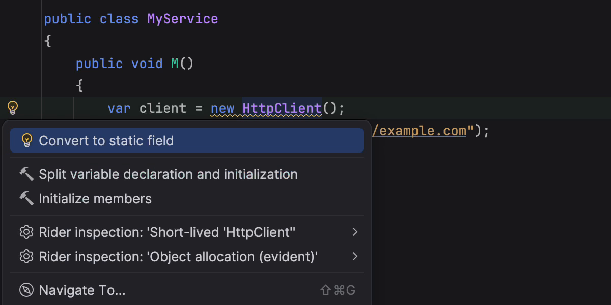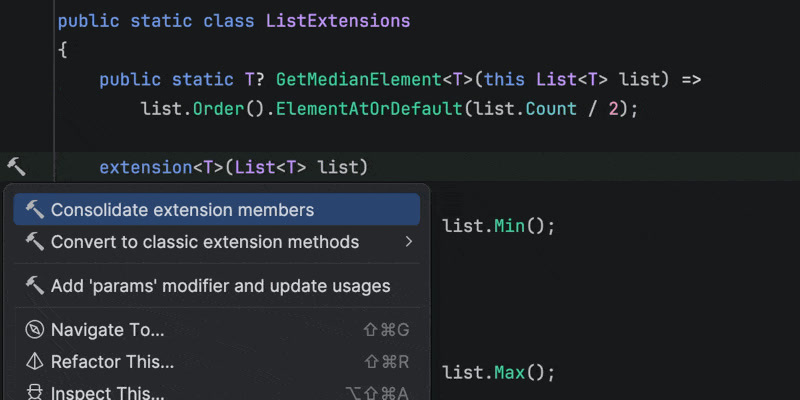Rider 2026.1 では、コード分析機能の改善、新しいインスペクション、進化する言語機能のサポートが提供されます。C# 拡張メンバーのサポート強化には、ナビゲーションとリファクタリングの改善に加え、必要に応じて不足している拡張メンバーを自動的にインポートするクイックフィックス機能の改善が含まれます。