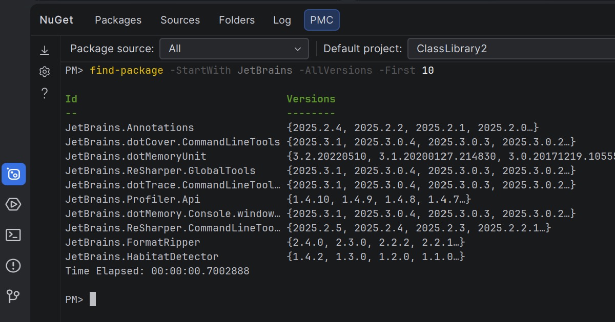 Rider 2026.1 は、NuGet の PowerShell ベースのワークフローを IDE に統合し、現在プレビュー版であるパッケージマネージャーコンソール(PMC)を提供します。