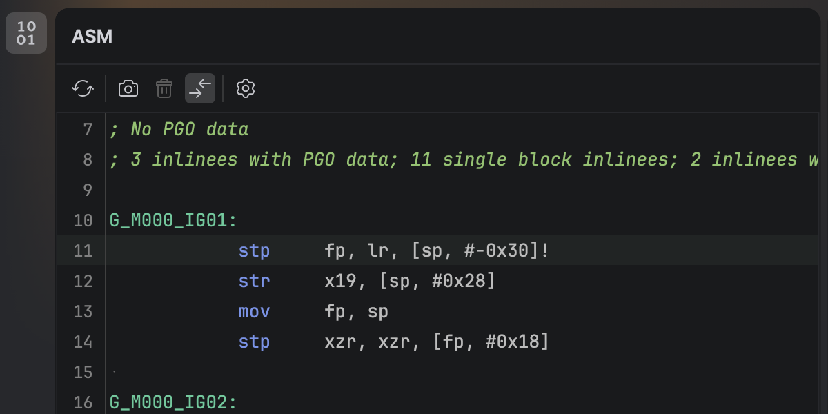 Rider を移動することなく、C# コードから生成されたネイティブ逆アセンブリを表示できるようになりました。新しい .NET 逆アセンブラプラグインをインストールすると、新しい ASM ビューアーツールウィンドウ内で、JIT、ReadyToRun、NativeAOT コンパイラーによって生成された出力をインスペクションできるようになります。