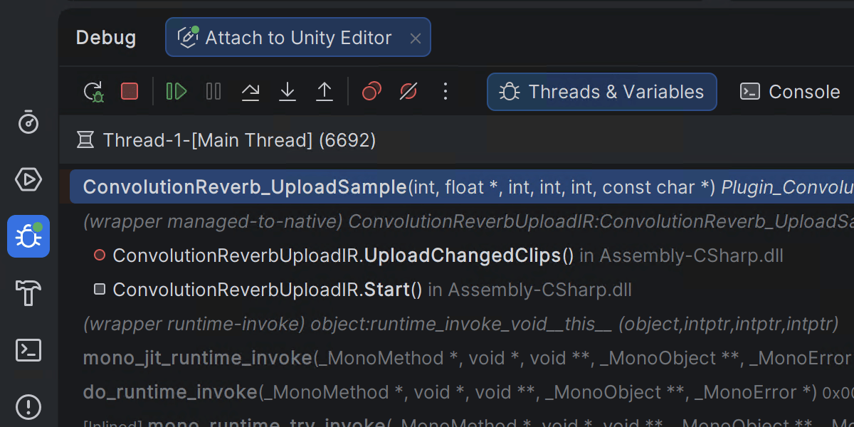Rider 2026.1 では、混合モードデバッグが導入されました。これにより、単一のデバッグセッションでマネージドコード(.NET および .NET フレームワーク)とネイティブコード(C/C++)の両方をデバッグできます。これは、.NET コードがネイティブライブラリを呼び出す場合や、マネージドコンポーネントとネイティブコンポーネントが混在して構築されたゲームエンジンなど、マネージドとネイティブの境界を越えるアプリケーションに特に役立ちます。