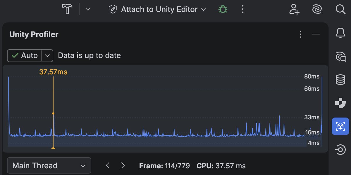 Unity プロファイラのスナップショットを Rider で直接開き、専用の プロファイラーツールウィンドウでフレームとコールスタックの構造化されたビューで分析できるようになりました。タイムラインビューではフレームごとの CPU 時間が表示されるため、処理の遅いフレームやパフォーマンスのホットスポットをすばやく特定できます。
