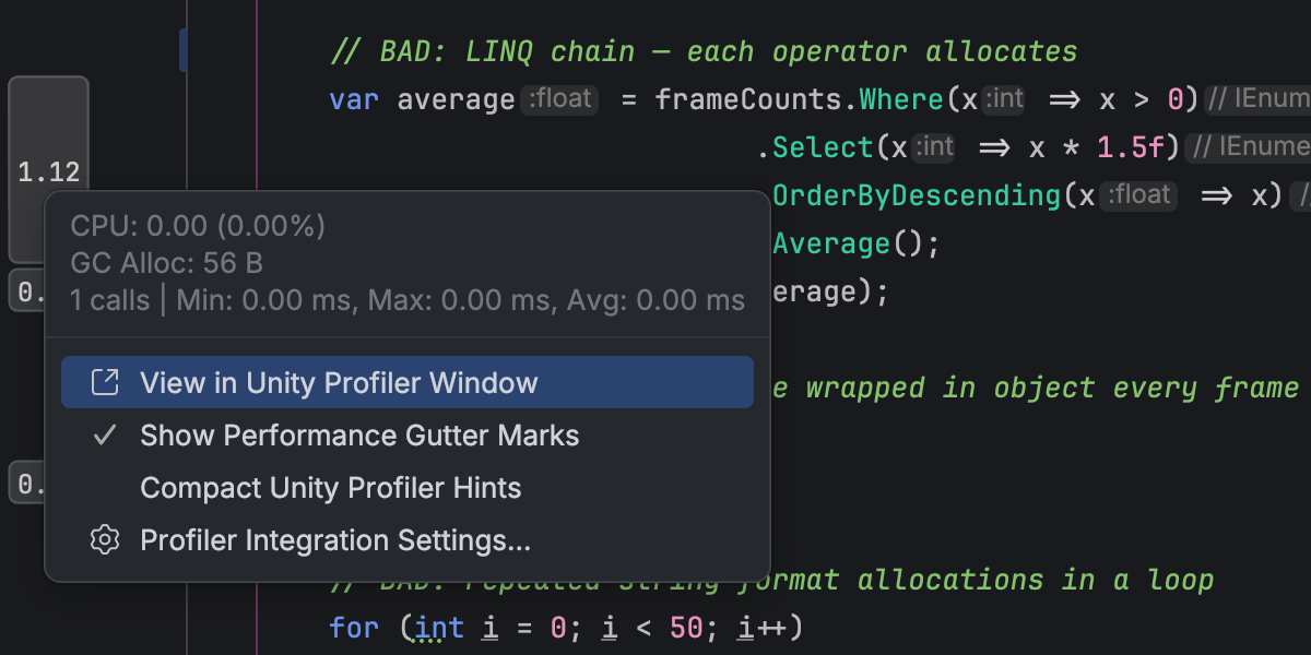 この統合により、Unity エディターと Rider 間のコンテキスト切り替えが軽減され、ランタイムの問題を調査する際に、パフォーマンスデータとコード間をより自然に切り替えることができるようになります。